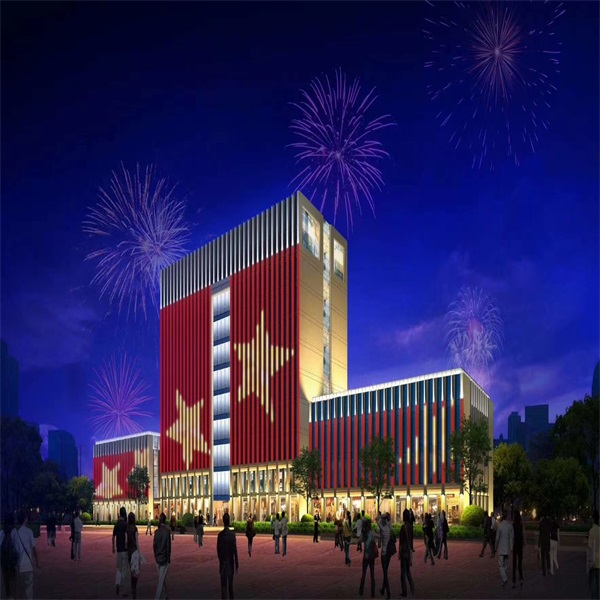 楼梯照明亮化建筑正面以玻璃幕墙为主,大气典雅,新风貌为主导,灯光表达以线性光为主,顺着 下面大理石柱的延伸线,在玻璃幕墙上下槽线中,以七彩流星拖尾形式,动感演绎,缓缓带着人们 的目光往上游走,时尚感十足。